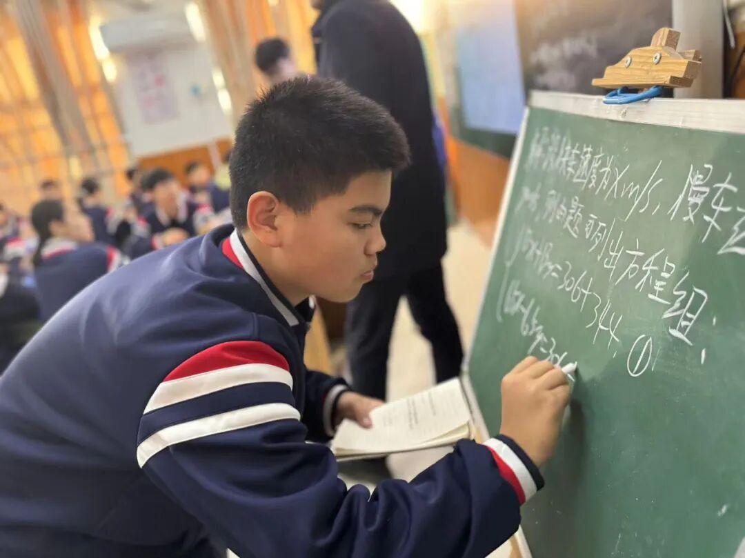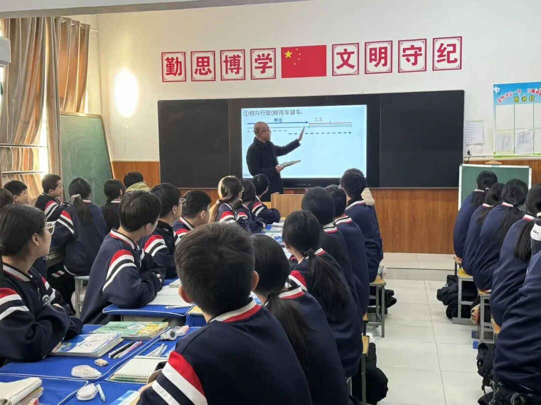 宋军老师讲授了八年级数学《火车行程问题》推导过程,宋老师循循诱导,启发学生思考探究,他通过多媒体动画线段示意图帮助学生找到题目中隐藏的等量关系。同时,宋老师还注重培养学生的逻辑思维能力和数学应用能力,鼓励学生们积极思考、主动探究,提出了问题并解决问题,激发了学生们的学习兴趣。除了精彩的课堂讲解外,宋老师还设计了丰富多样的练习题,在探究问题的解决过程中,让学生到黑板上进行展示。课堂最后带领学生一起回顾本节课的重难知识点。